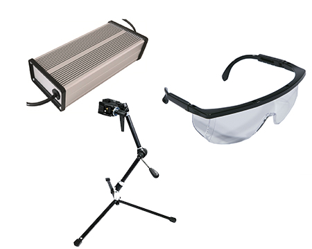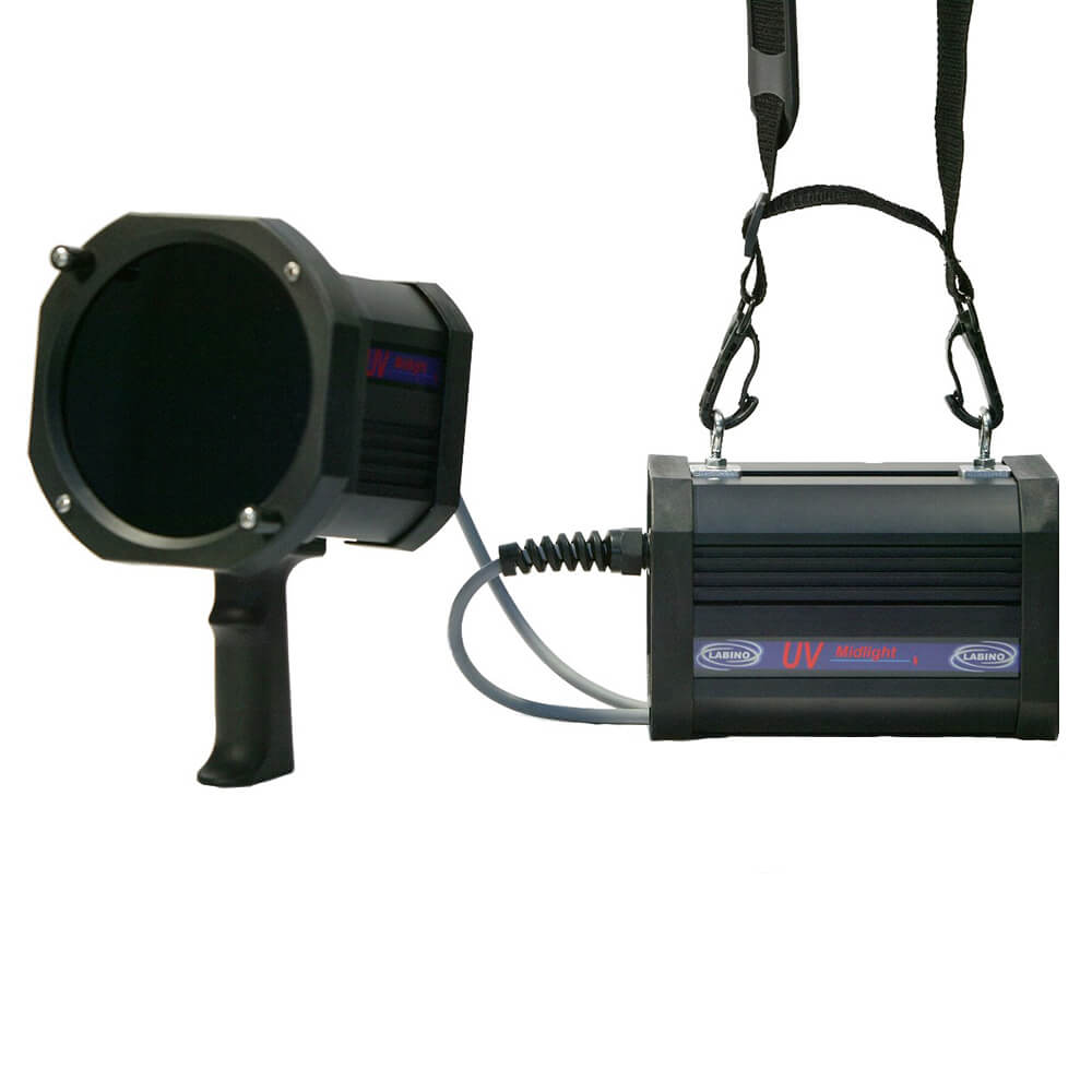 The Labino UVG4 is a UV LED Head Lamp designed to free the user’s hands during an inspection. The lamp can be adjusted in three different angles. The operator can switch the angles of the light during the inspection. The rubber bands are adjustable and fit helmets as well as heads. The battery is located in the back of the structure and there are no cables hanging from the lamp.